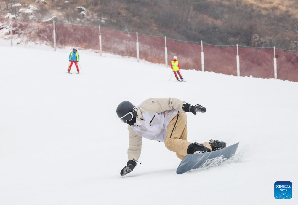 A man snowboards at Yulongwan ski resort in Yutian County, Tangshan City of north China's Hebei Province on Jan. 14, 2026. (Photo by Liu Mancang/Xinhua)