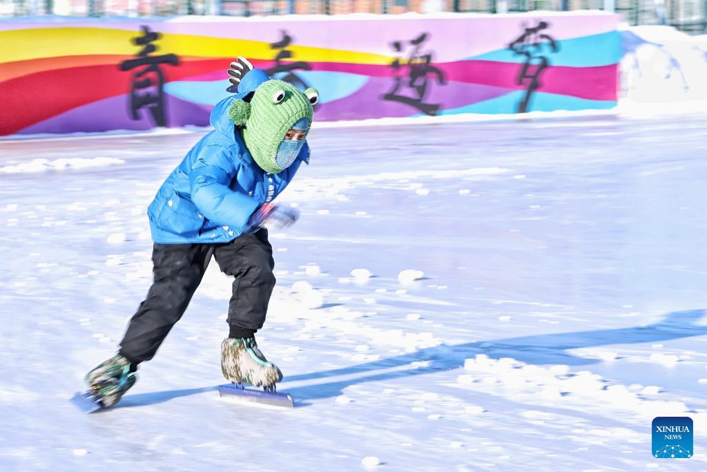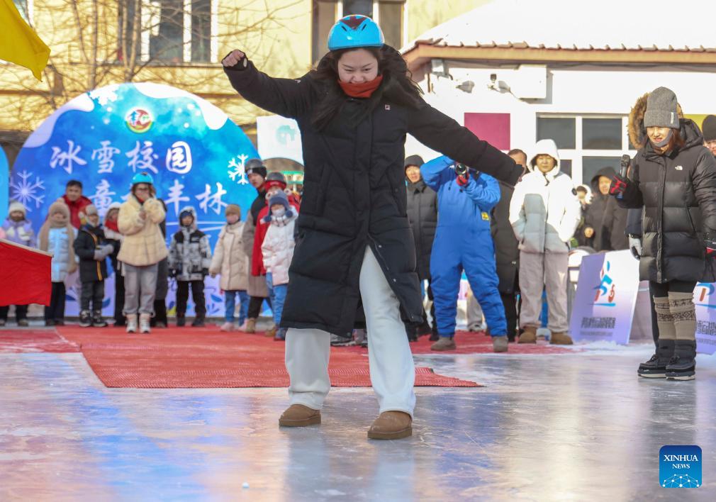 People take part in an ice-sliding game at an elementary school in Yichun City, northeast China's Heilongjiang Province, Jan. 15, 2026. (Photo by Li Jiaxing/Xinhua)