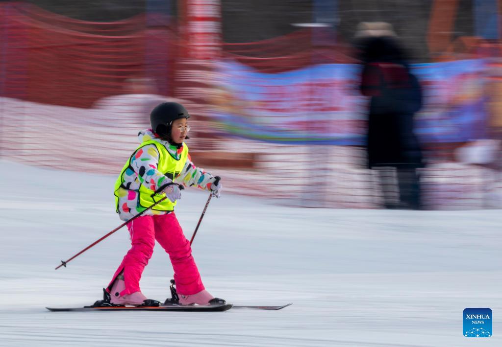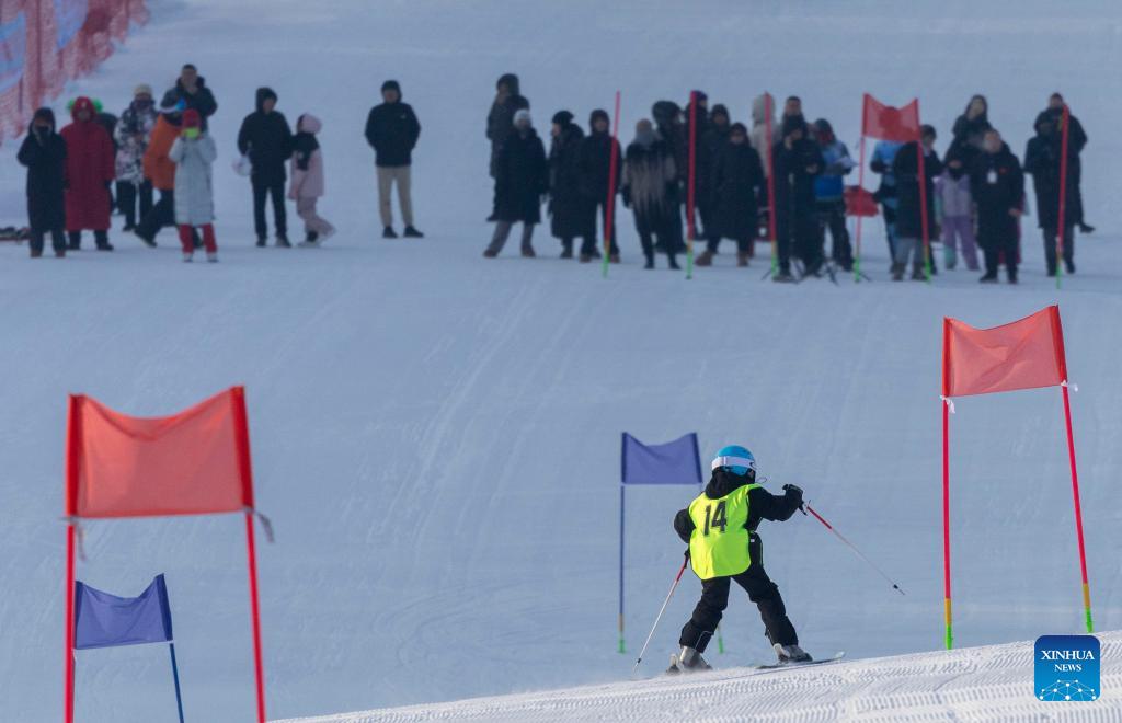A student competes in an elementary school skiing event in Shuangyashan, northeast China's Heilongjiang Province, Jan. 13, 2026. (Photo by Han Yang/Xinhua)