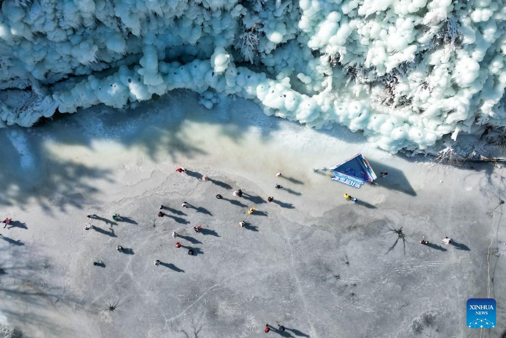 An aerial drone photo shows people having fun on a frozen lake at Jiuru mountain scenic spot in Jinan City, east China's Shandong Province, Jan. 13, 2026. (Photo by Hao Xincheng/Xinhua)