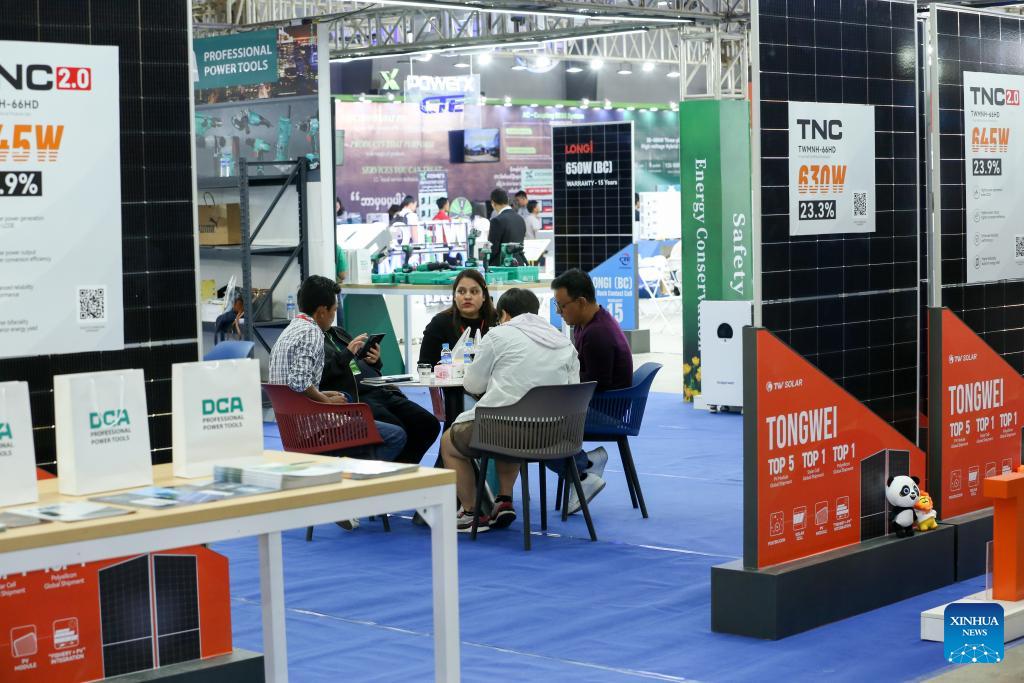 People talk at an exhibition booth during the Myanmar Power and Solar Energy Storage Lighting Expo 2026 at the Yangon Convention Center in Yangon, Myanmar, Jan. 16, 2026. The three-day exhibition kicked off in Myanmar on Friday, attracted more than 70 exhibitors. (Xinhua/Myo Kyaw Soe)