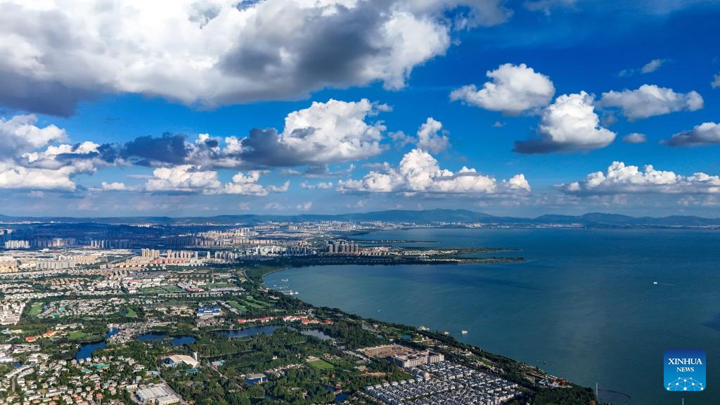 An aerial drone photo taken on Sept. 3, 2025 shows the scenery of Dianchi Lake in Kunming City, southwest China's Yunnan Province. The water quality in Dianchi Lake has been maintaining on high quality level for eight consecutive years, according to the Dianchi Lake administration bureau. (Xinhua/Peng Yikai)