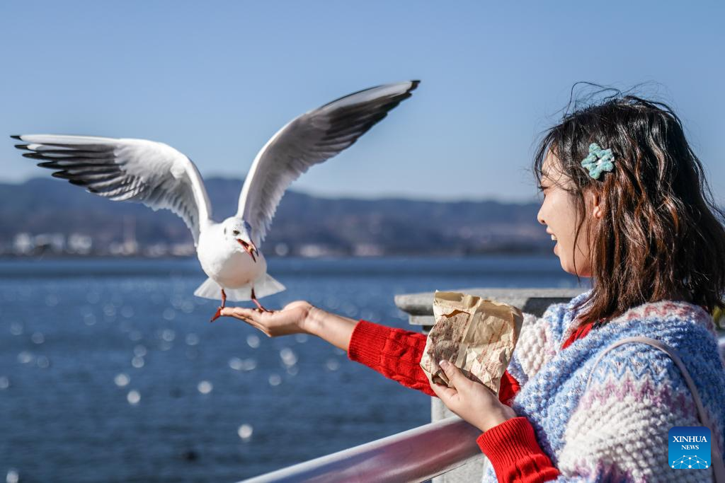 A woman feeds a black-headed gull beside the Dianchi Lake in Kunming City, southwest China's Yunnan Province, Jan. 22, 2026. The water quality in Dianchi Lake has been maintaining on high quality level for eight consecutive years, according to the Dianchi Lake administration bureau. (Xinhua/Peng Yikai)