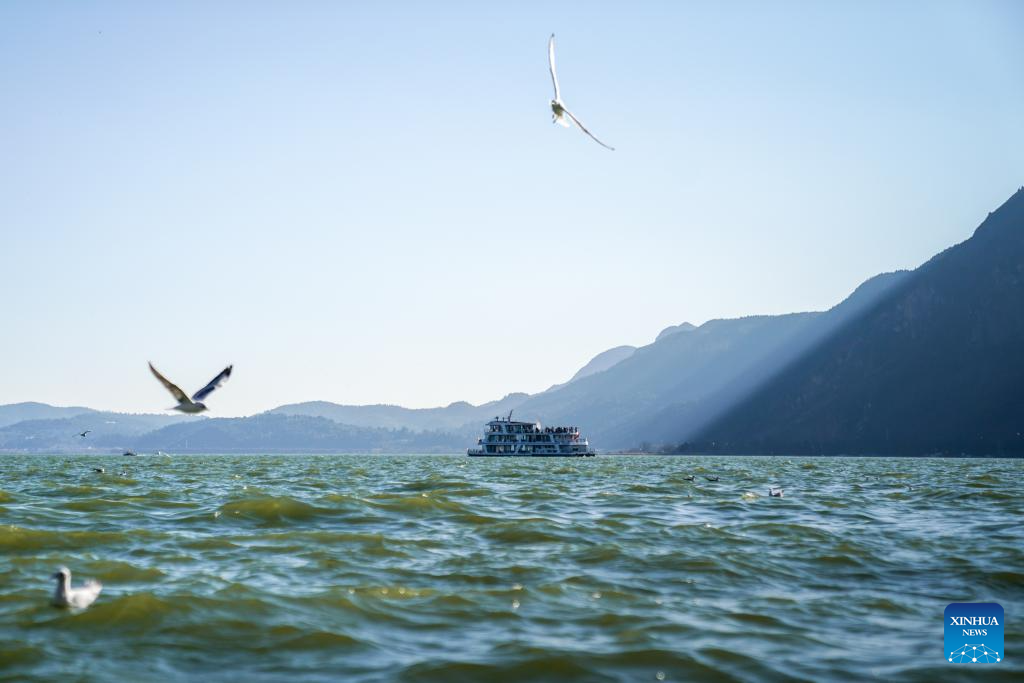 People take a sightseeing ferry on the Dianchi Lake in Kunming City, southwest China's Yunnan Province, Jan. 22, 2026. The water quality in Dianchi Lake has been maintaining on high quality level for eight consecutive years, according to the Dianchi Lake administration bureau. (Xinhua/Peng Yikai)