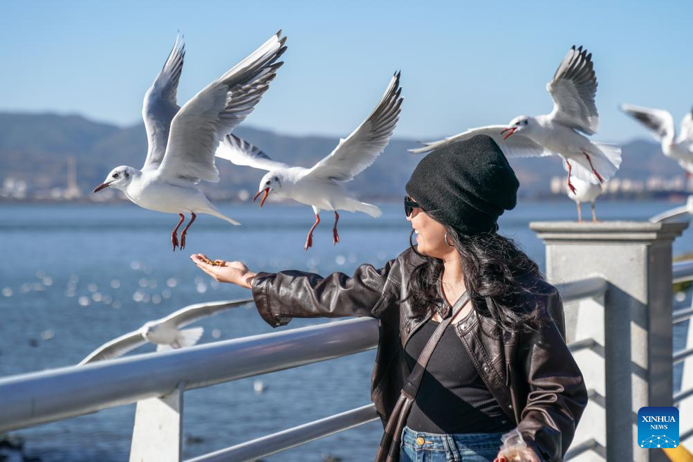 A woman feeds black-headed gulls beside the Dianchi Lake in Kunming City, southwest China's Yunnan Province, Jan. 22, 2026. The water quality in Dianchi Lake has been maintaining on high quality level for eight consecutive years, according to the Dianchi Lake administration bureau. (Xinhua/Peng Yikai)