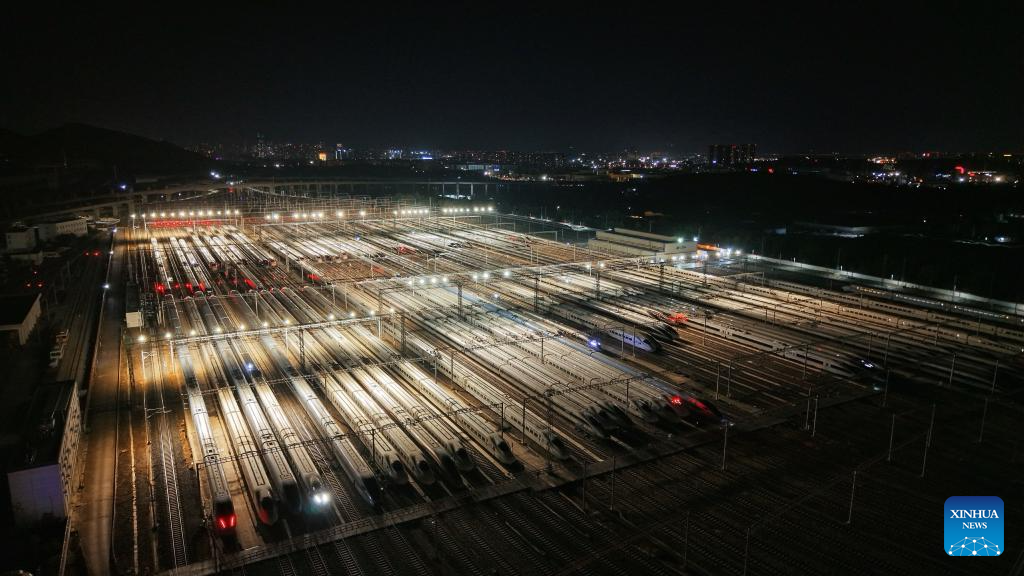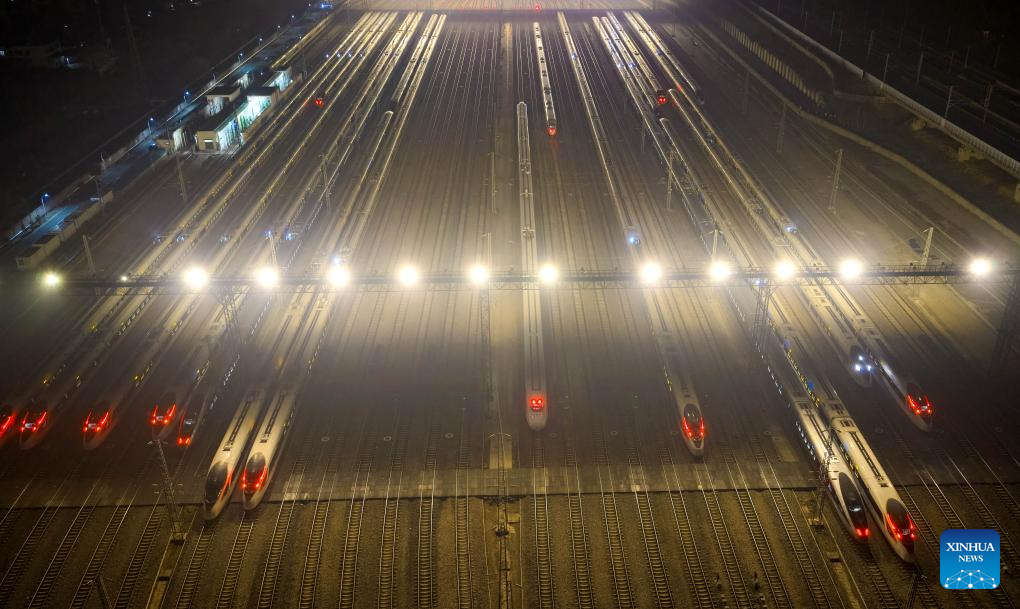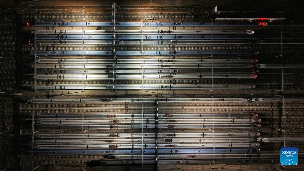 A drone photo taken on Jan. 25, 2026 shows bullet trains parking at a bullet train depot in Nanjing City, east China's Jiangsu Province. A new train schedule will be put into effect in China from Jan. 26. 2026. (Photo by Yang Suping/Xinhua)