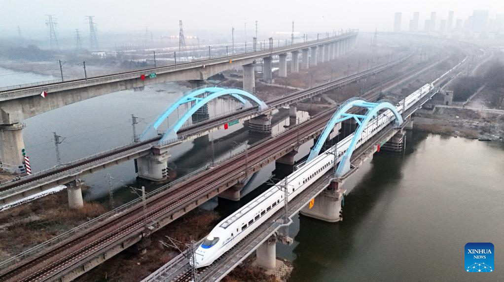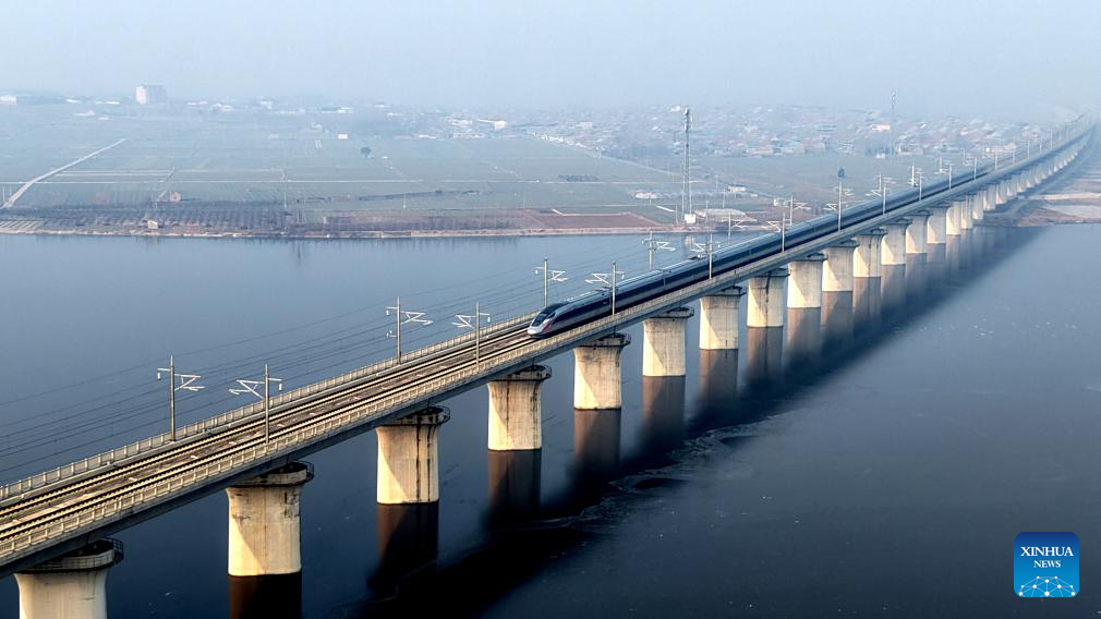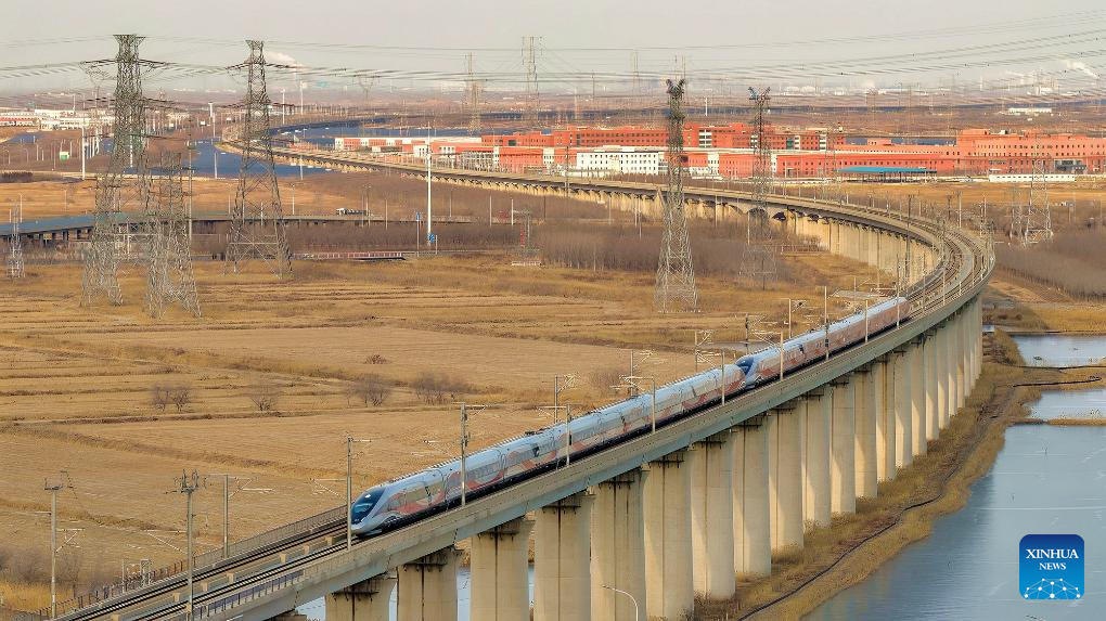 A drone photo taken on Jan. 25, 2026 shows a bullet train running in north China's Tianjin Municipality. A new train schedule will be put into effect in China from Jan. 26. 2026. (Photo by Du Penghui/Xinhua)