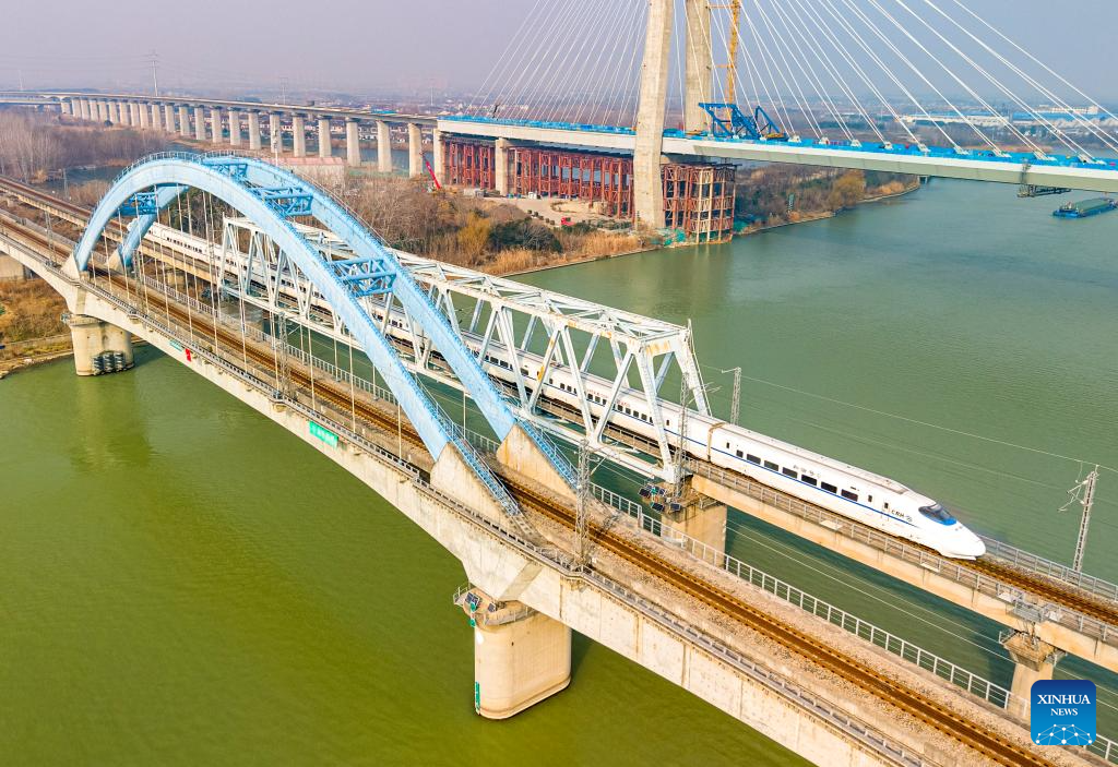 A drone photo taken on Jan. 25, 2026 shows a bullet train running in Yangzhou City of east China's Jiangsu Province. A new train schedule will be put into effect in China from Jan. 26. 2026. (Photo by Meng Delong/Xinhua)