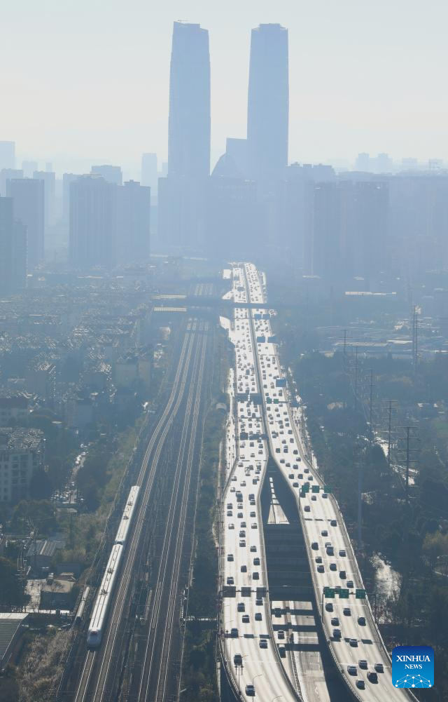 A bullet train (lower L) runs in the urban area of Kunming City, southwest China's Yunnan Province, Jan. 25, 2026. A new train schedule will be put into effect in China from Jan. 26. 2026. (Photo by Zheng Yi/Xinhua)