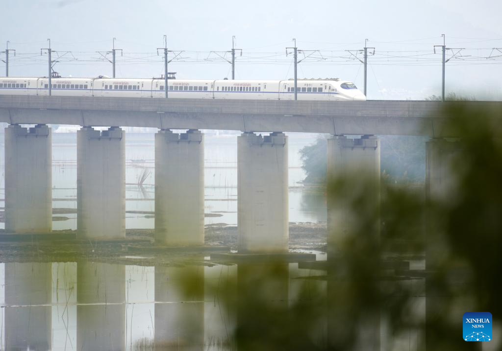 A bullet train runs on tracks over a reservoir in Malong District of Qujing City, southwest China's Yunnan Province, Jan. 25, 2026. A new train schedule will be put into effect in China from Jan. 26. 2026. (Photo by Yang Junpeng/Xinhua)