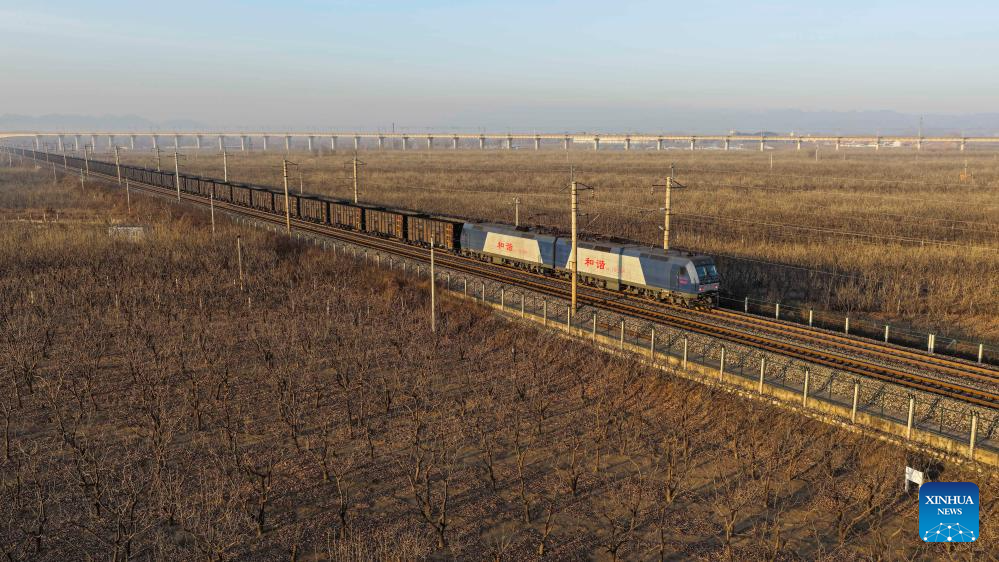 A drone photo taken on Jan. 25, 2026 shows a freight train transporting coal on the Datong-Qinhuangdao Railway in Zunhua City, north China's Hebei Province. A new train schedule will be put into effect in China from Jan. 26. 2026. (Photo by Liu Mancang/Xinhua)
