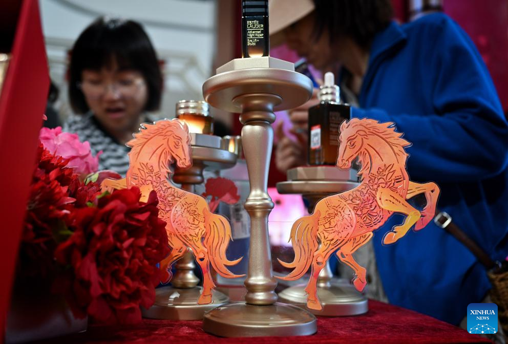 This photo taken on Jan. 24, 2026 shows Year of the Horse decorations at Haikou International Duty Free Shopping Complex in Haikou, south China's Hainan Province. With the Year of the Horse approaching, many international brands have incorporated Chinese zodiac culture and traditional Chinese design elements into their products, launching Year of the Horse editions to compete in the Chinese Lunar New Year market. (Xinhua/Guo Cheng)