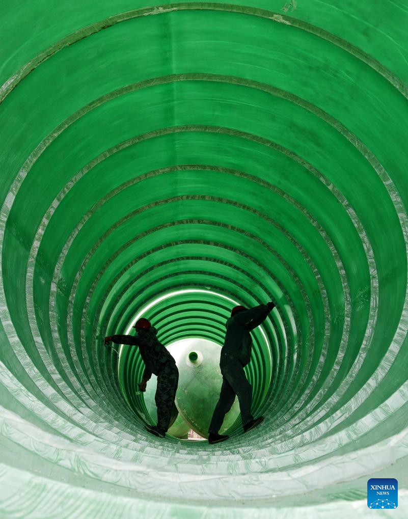 Workers make polluted-water processing devices at a water environmental engineering company in Nanmo Town of Hai'an City, east China's Jiangsu Province, Jan. 28, 2026. Enterprises across the country are going full steam ahead in production at the end of January, striving for a strong start in the first month of a new year. (Photo by Zhou Qiang/Xinhua)