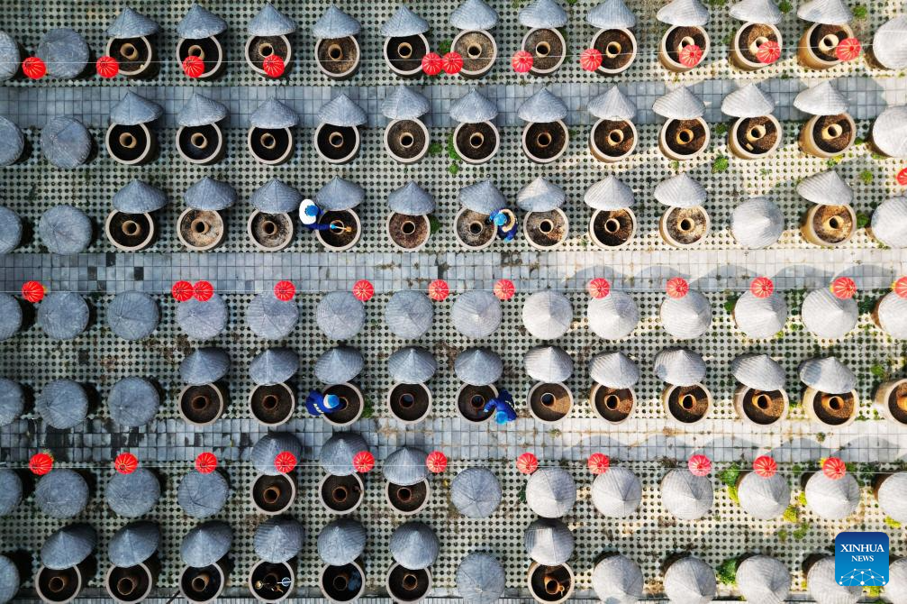 A drone photo taken on Jan. 29, 2026 shows employees stirring fermenting soy sauce at a traditional brewery in Tengzhou, east China's Shandong Province. (Photo by Li Zhijun/Xinhua)