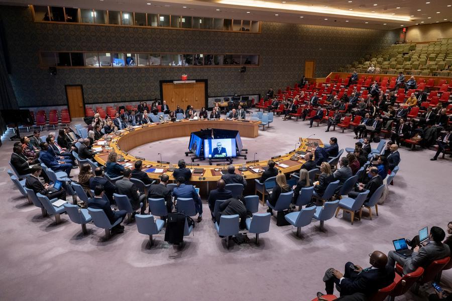 UN Deputy Special Coordinator for the Middle East Peace Process Ramiz Alakbarov speaks via a video link at a Security Council meeting at the UN headquarters in New York, January 28, 2026. Alakbarov said Wednesday that there might be a turning point for Gaza, with both profound opportunity and considerable risk. (Photo: Xinhua)