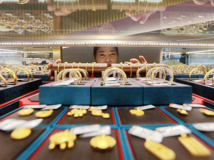 A staff member arranges gold accessories at a gold shop in Yangzhou city of East China's Jiangsu Province, January 29, 2026. Both the international spot gold price and the April gold futures price on the New York Mercantile Exchange broke through the historical high of $5,500 per ounce on January 28. (Photo: Xinhua)