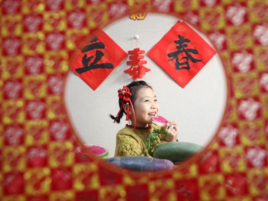A girl eats a radish (a Chinese folk custom literally meaning "Biting the Spring") in Tangshan, North China's Hebei Province, February 3, 2026. (Photo: Xinhua)