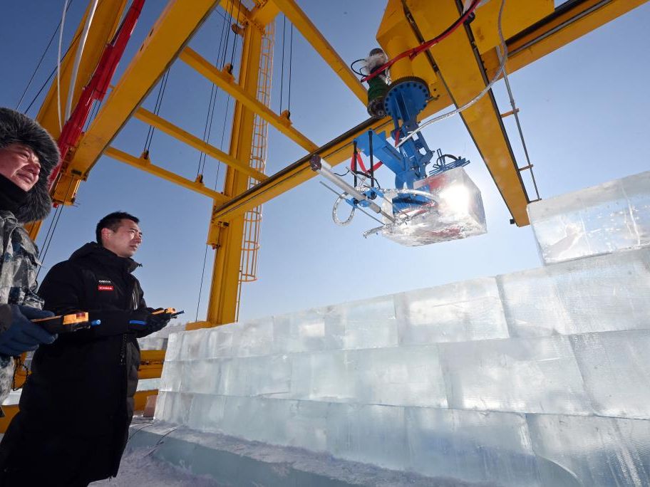 An automated ice block stacking robot has entered the testing phase at the 27th Harbin Ice and Snow World on February 3. The robot is capable of lifting, transporting, and assembling ice blocks with millimeter-level precision. (Photo: Xinhua)