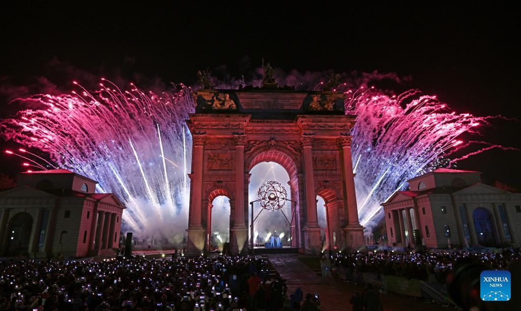 Fireworks illuminate the night sky at the Arco della Pace during the opening ceremony of the Milan-Cortina 2026 Olympic Winter Games in Milan, Italy, Feb. 6, 2026. (Xinhua/Sun Fei)