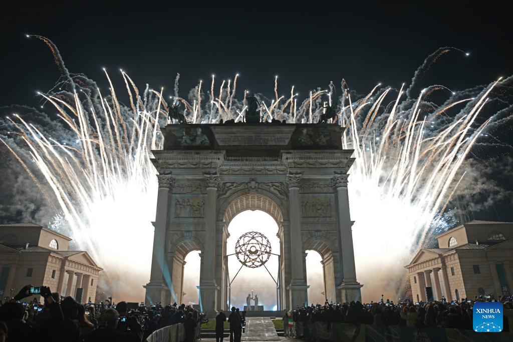 Fireworks illuminate the night sky at the Arco della Pace during the opening ceremony of the Milan-Cortina 2026 Olympic Winter Games in Milan, Italy, Feb. 6, 2026. (Xinhua/Wu Wei)