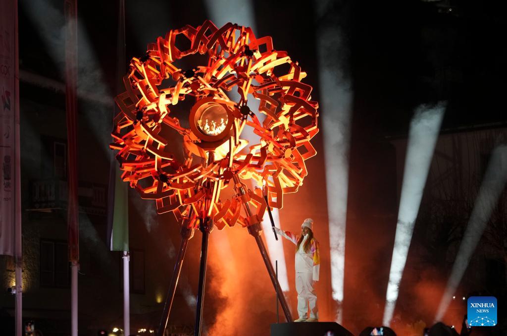 (260206) -- CORTINA D'AMPEZZO, Feb. 6, 2026 (Xinhua) -- The cauldron of the Milan-Cortina 2026 Olympic Winter Games is ignited in Piazza Angelo Dibona in Cortina, Italy, Feb. 6, 2026. (Xinhua/Li Gang)