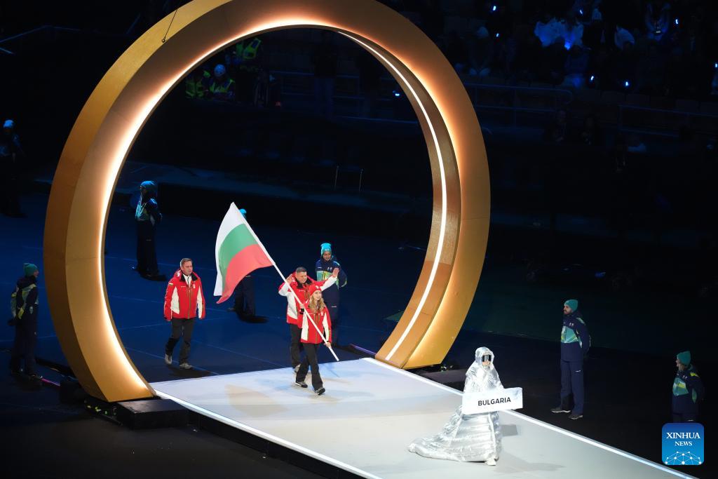 The delegation of Bulgaria parades into the San Siro Olympic Stadium during the opening ceremony of the Milan-Cortina 2026 Olympic Winter Games in Milan, Italy, Feb. 6, 2026. (Xinhua/Xue Yuge)