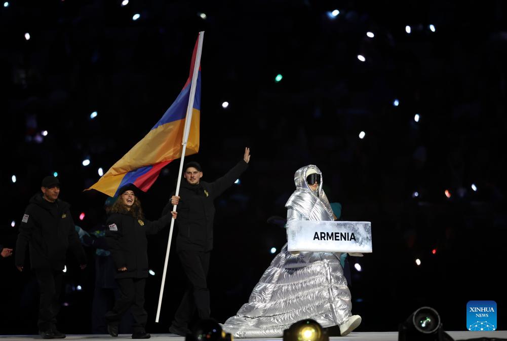 The delegation of Armenia parades into the San Siro Olympic Stadium during the opening ceremony of the Milan-Cortina 2026 Olympic Winter Games in Milan, Italy, Feb. 6, 2026. (Xinhua/Li Jing)