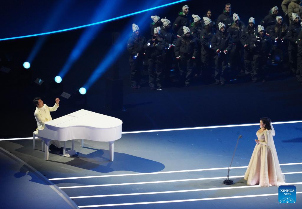 Chinese pianist Lang Lang (L) and Italian opera singer Cecilia Bartoli perform during the opening ceremony of the Milan-Cortina 2026 Olympic Winter Games at the San Siro Olympic Stadium in Milan, Italy, Feb. 6, 2026. (Xinhua/Xue Yuge)