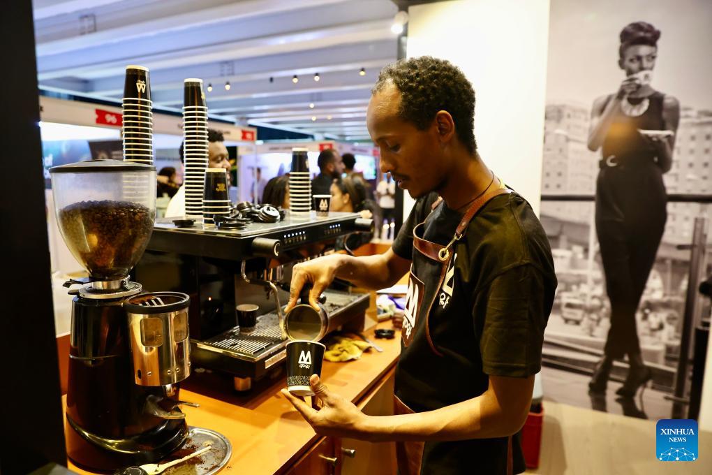 A barista makes coffee for visitors during the 22nd African Fine Coffees Conference and Exhibition in Addis Ababa, Ethiopia, Feb. 6, 2026. The 22nd African Fine Coffees Conference and Exhibition, running from February 4 to 6, 2026, has brought together producers, exporters, traders, roasters, investors, policymakers, and development partners to promote African coffee excellence and strengthen global market linkages. (Xinhua/Geng Xinning)