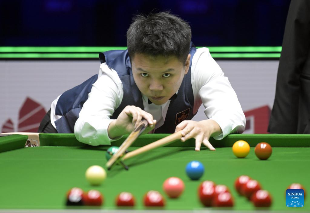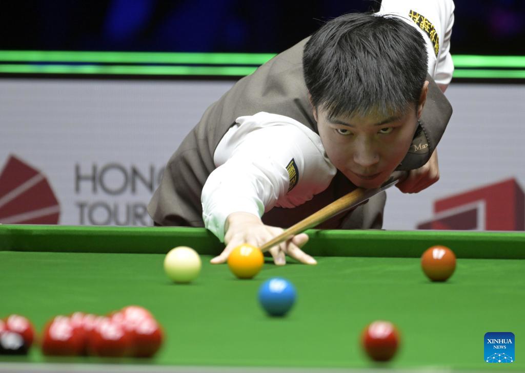 Zhou Yuelong competes during the quarterfinal between Zhou Yuelong of China and Ali Carter of England at the Snooker World Grand Prix 2026 in Hong Kong, south China, Feb. 6, 2026. (Xinhua/Lo Ping Fai)