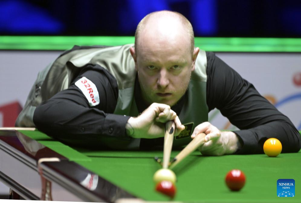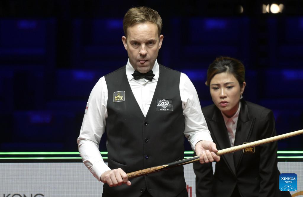 Ali Carter reacts during the quarterfinal between Zhou Yuelong of China and Ali Carter of England at the Snooker World Grand Prix 2026 in Hong Kong, south China, Feb. 6, 2026. (Xinhua/Lo Ping Fai)
