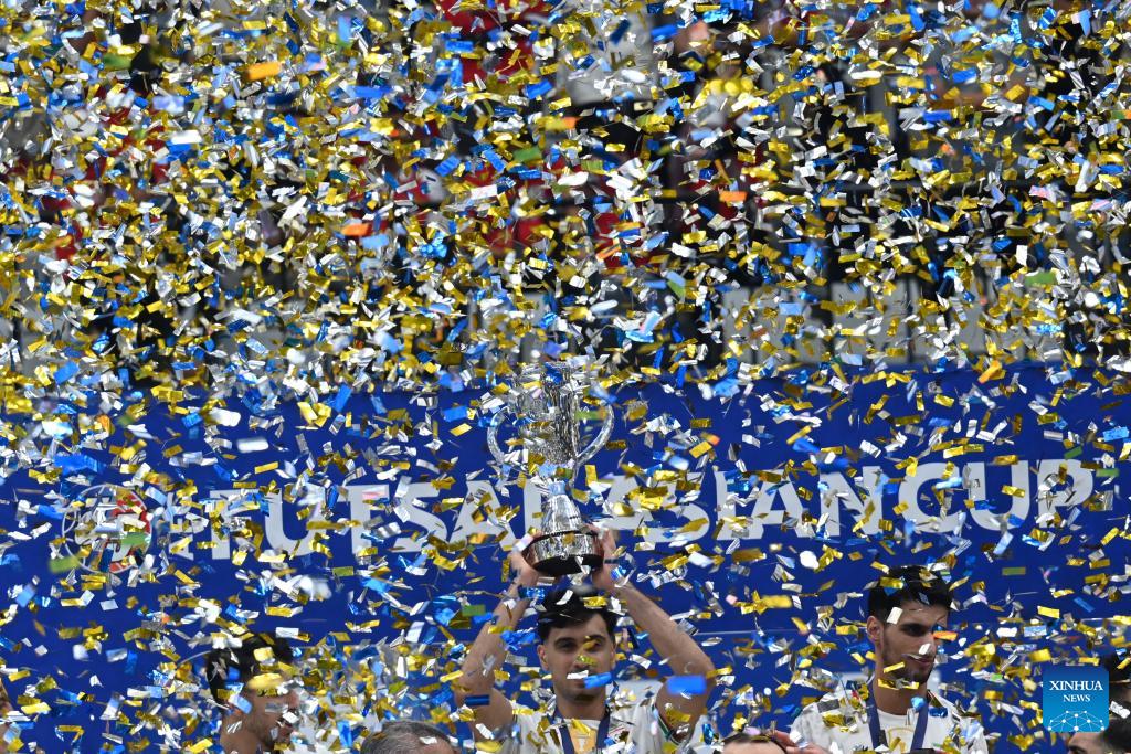 Gold medalists team Iran celebrate during the awarding ceremony after the final match between Indonesia and Iran at the AFC Futsal Asian Cup 2026 in the Indonesia Arena stadium, Jakarta, Indonesia, Feb. 7, 2026. (Xinhua/Agung Kuncahya B.)