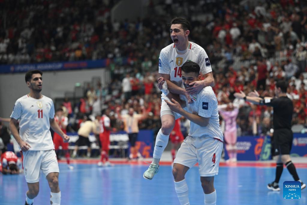 Players of team Iran celebrate after scoring penalty shoot during the final match between Indonesia and Iran at the AFC Futsal Asian Cup 2026 in the Indonesia Arena stadium, Jakarta, Indonesia, Feb. 7, 2026. (Xinhua/Agung Kuncahya B.)