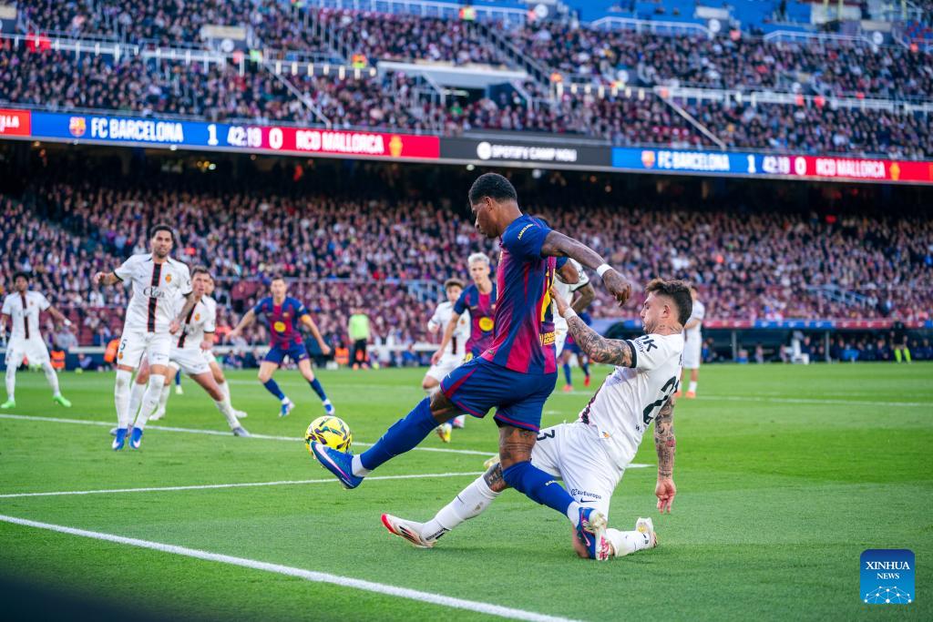 Marcus Rashford (front L) of Barcelona vies with Pablo Maffeo (front R) of Mallorca during La Liga football match between FC Barcelona and RCD Mallorca in Barcelona, Spain, Feb. 7, 2026. (Photo by Joan Gosa/Xinhua)