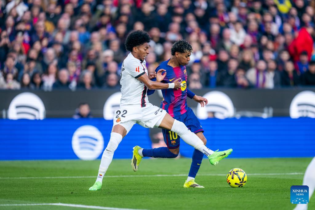 Lamine Yamal (R) of Barcelona vies with Johan Mojica of Mallorca during La Liga football match between FC Barcelona and RCD Mallorca in Barcelona, Spain, Feb. 7, 2026. (Photo by Joan Gosa/Xinhua)