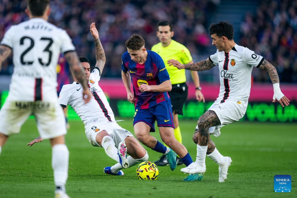 Fermin Lopez (2nd R) of Barcelona vies with Omar Mascarell (2nd L) of Mallorca during La Liga football match between FC Barcelona and RCD Mallorca in Barcelona, Spain, Feb. 7, 2026. (Photo by Joan Gosa/Xinhua)