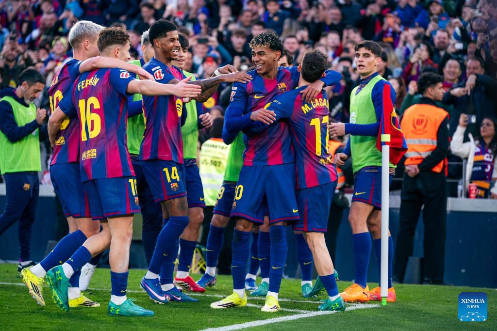 Players of Barcelona celebrate the score during La Liga football match between FC Barcelona and RCD Mallorca in Barcelona, Spain, Feb. 7, 2026. (Photo by Joan Gosa/Xinhua)