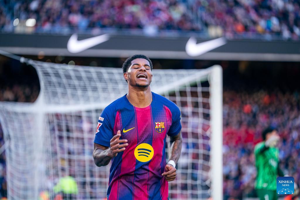 Marcus Rashford of Barcelona reacts during La Liga football match between FC Barcelona and RCD Mallorca in Barcelona, Spain, Feb. 7, 2026. (Photo by Joan Gosa/Xinhua)