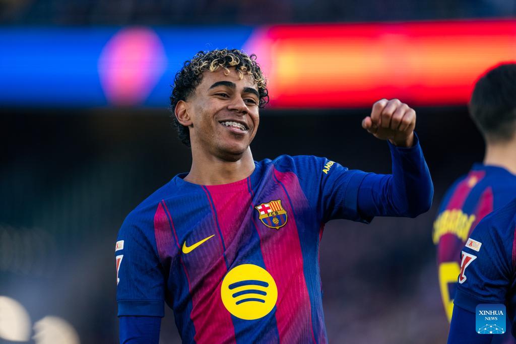 Lamine Yamal of Barcelona celebrates his score during La Liga football match between FC Barcelona and RCD Mallorca in Barcelona, Spain, Feb. 7, 2026. (Photo by Joan Gosa/Xinhua)