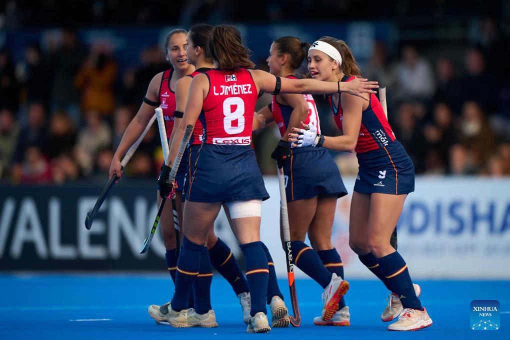 Players of Spain celebrate a goal during an FIH Hockey Pro League women's match between Spain and Belgium in Valencia, Spain, Feb. 8, 2026 (Photo by Pablo Morano/Xinhua)