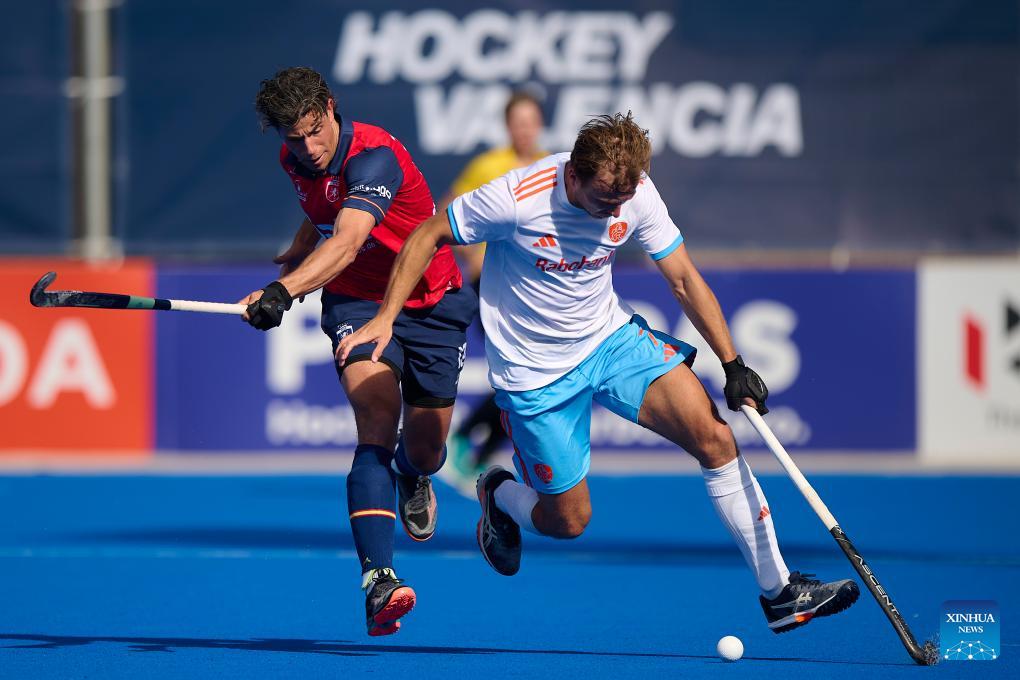 Joaquin Menini (L) of Spain vies with Thijs Van Dam of the Netherlands during an FIH Hockey Pro League men's match between Spain and the Netherlands in Valencia, Spain, Feb. 8, 2026. (Photo by Pablo Morano/Xinhua)