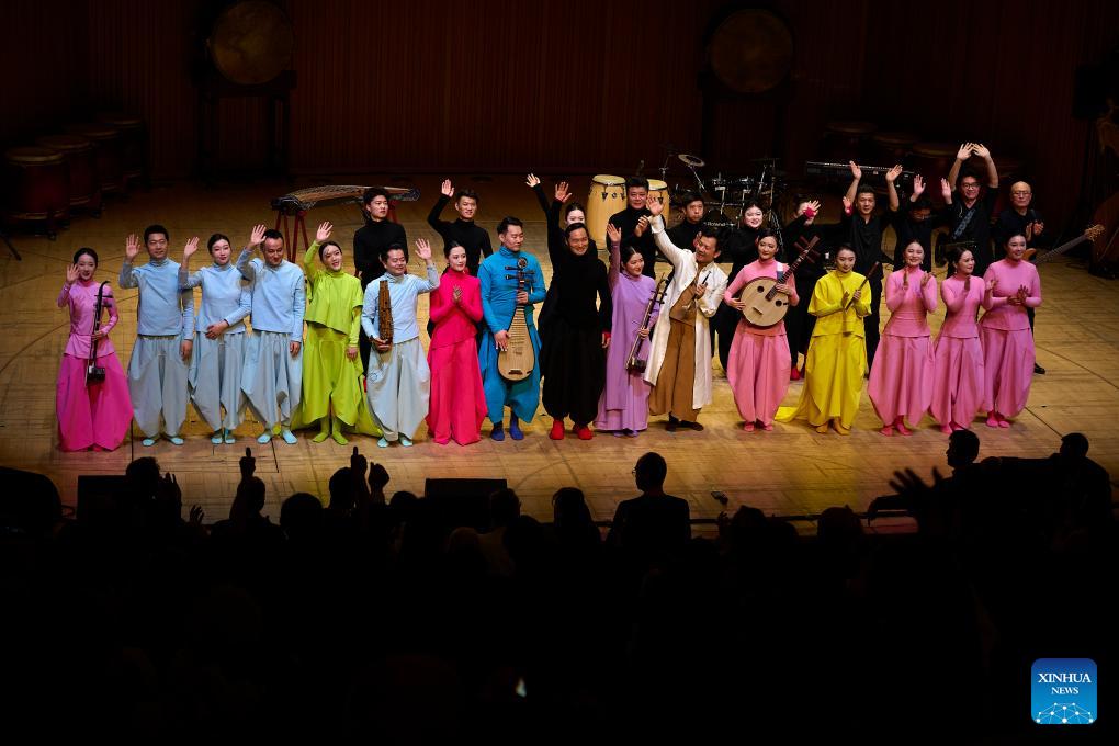 Members of the Shanghai Chinese Orchestra greet the audience after the "Colors of China" concert in Valencia, Spain, Feb. 10, 2026. (Photo by Pablo Morano/Xinhua)