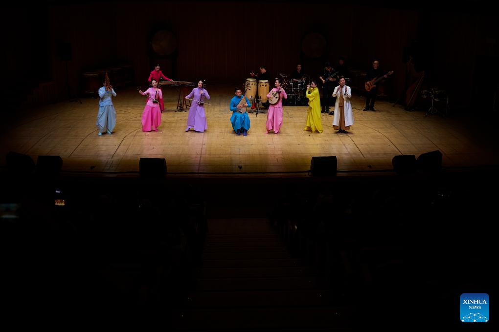 Members of the Shanghai Chinese Orchestra perform during the "Colors of China" concert in Valencia, Spain, Feb. 10, 2026. (Photo by Pablo Morano/Xinhua)