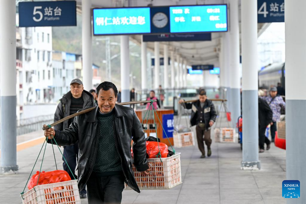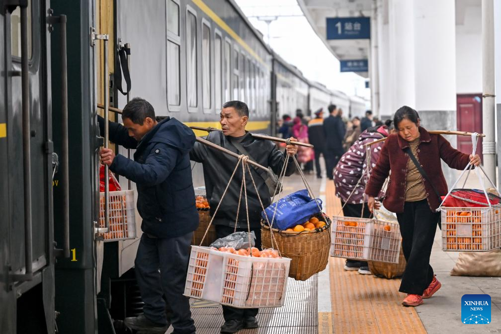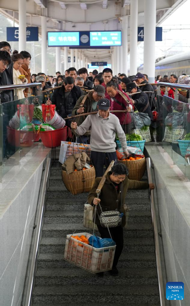 Villagers carrying goods for sale prepare to leave the Tongren Railway Station in Tongren City, southwest China's Guizhou Province, Feb. 12, 2026. The train No. 7272/7271 has run across the mountainous areas in Hunan, Guizhou and Chongqing for almost 20 years. With an average speed of just 40 kilometers per hour, the train has made it easier for residents along the route to travel and commute, while also helping local products reach wider markets. (Xinhua/Liu Xu)