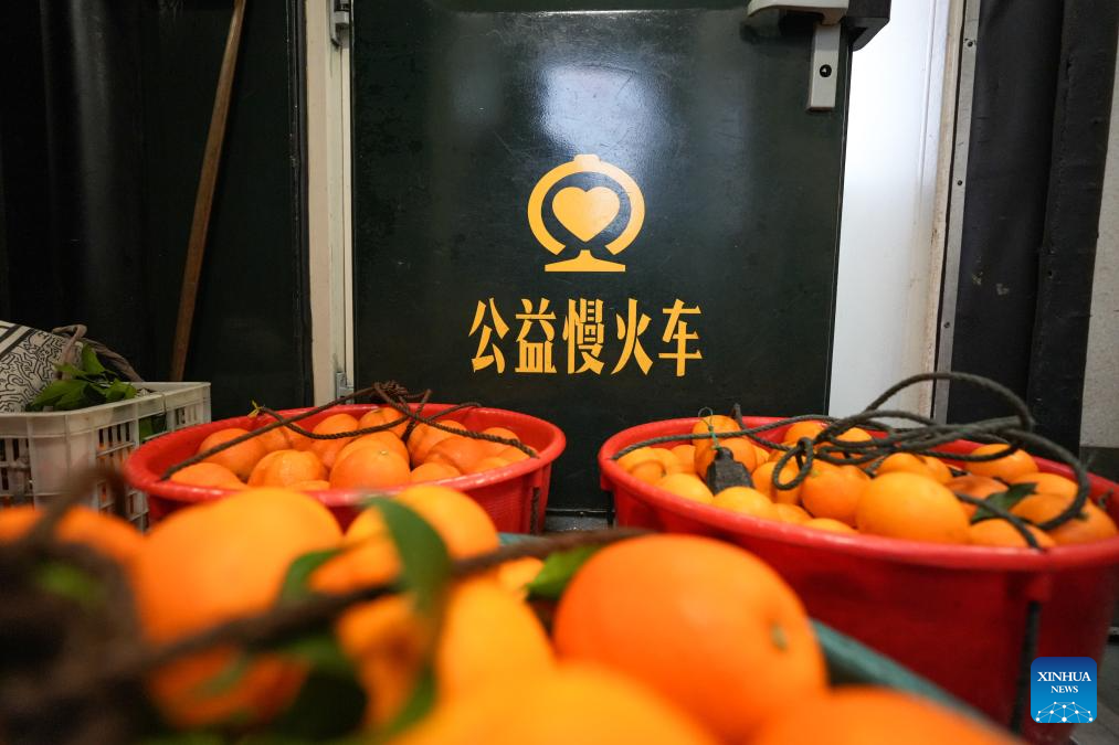 This photo taken on Feb. 12, 2026 shows fresh fruits on the train No. 7272. The train No. 7272/7271 has run across the mountainous areas in Hunan, Guizhou and Chongqing for almost 20 years. With an average speed of just 40 kilometers per hour, the train has made it easier for residents along the route to travel and commute, while also helping local products reach wider markets. (Xinhua/Liu Xu)