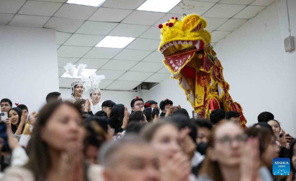Students of Al-Farabi Kazakh National University perform a dance during a Chinese New Year cultural event in Almaty, Kazakhstan, Feb. 13, 2026. (Xinhua/Li Renzi)