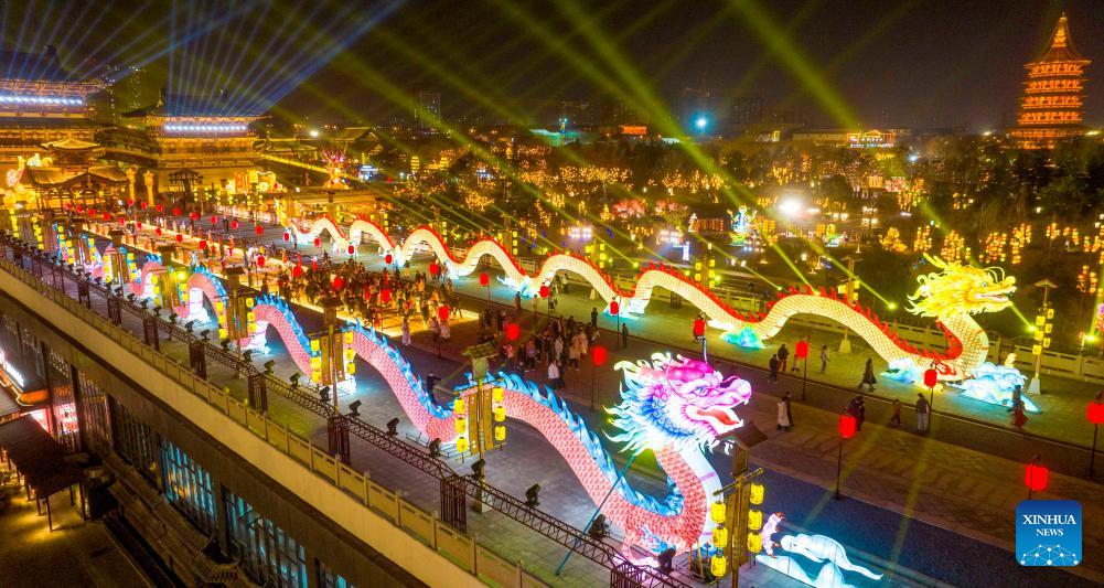 This aerial drone photo taken on Feb. 12, 2026 shows tourists viewing lanterns and lighting installations at a scenic area in Luoyang, central China's Henan Province. Various festive events are held across China to celebrate the upcoming Chinese New Year of the Horse. (Photo by Zhang Yixi/Xinhua)