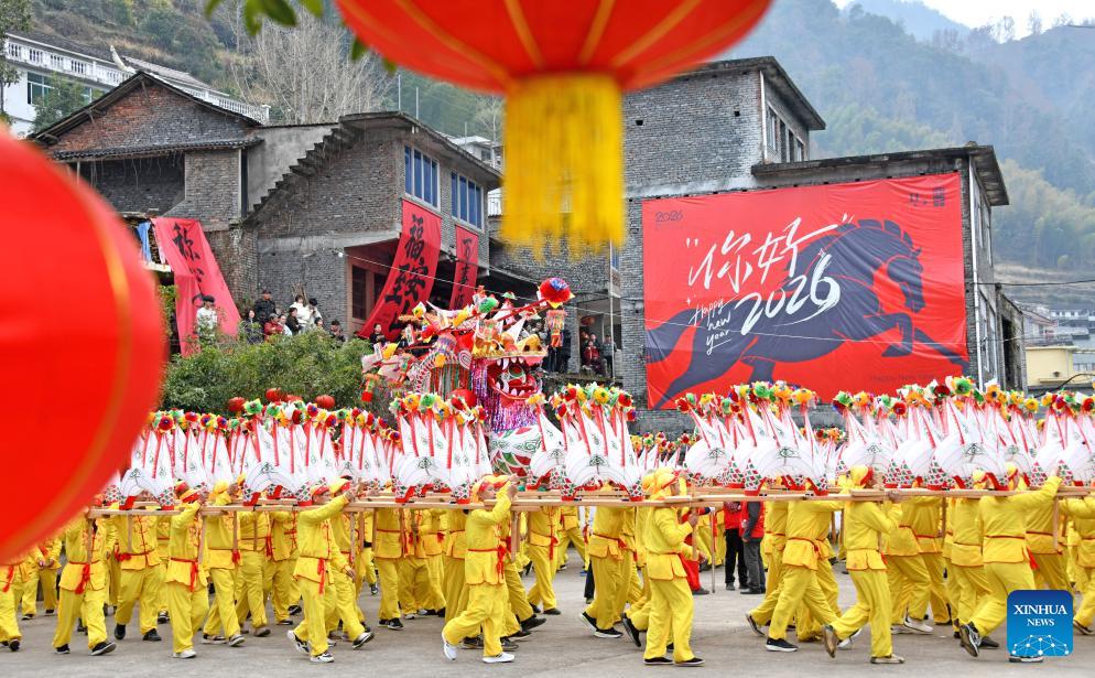 Villagers perform the wooden-bench dragon dance in Anshan Village of Xianju County in Taizhou, east China's Zhejiang Province, Feb. 13, 2026. Various festive events are held across China to celebrate the upcoming Chinese New Year of the Horse. (Photo by Wang Huabin/Xinhua)