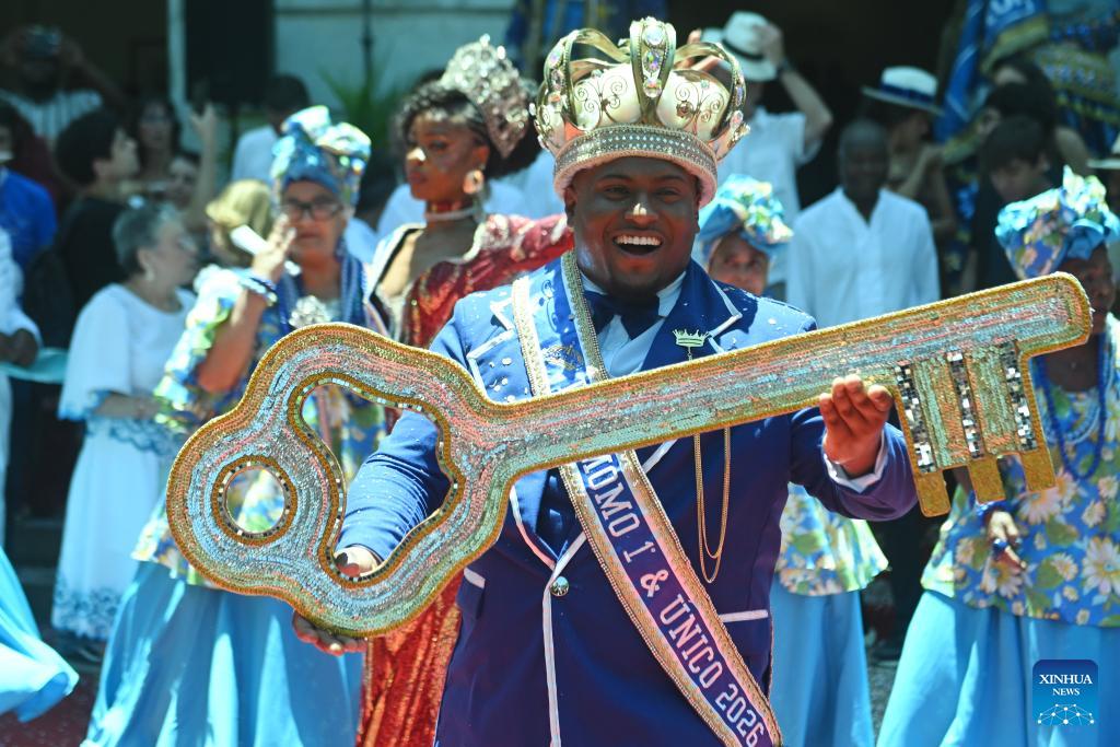 Carnival King holds a golden key at a ceremony that officially kicks off Carnival in Rio de Janeiro, Brazil, on Feb. 13, 2026. Rio de Janeiro Mayor Eduardo Paes on Friday handed over a golden key to the Carnival King, marking the official opening of the Carnival in the city. (Xinhua/Lucio Tavora)