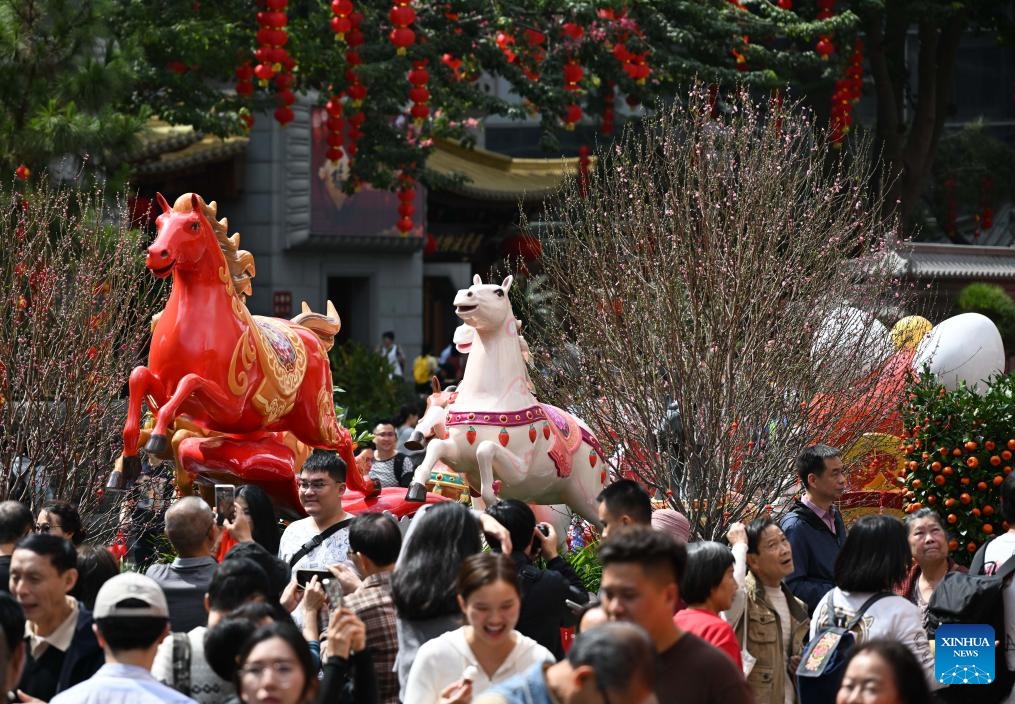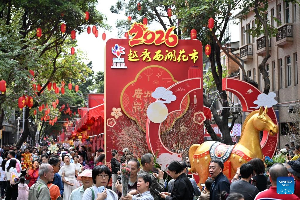People visit a flower market in Yuexiu District, Guangzhou, south China's Guangdong Province, Feb. 15, 2026. China is alive with vibrant celebrations with the Spring Festival just around the corner. (Xinhua/Deng Hua)